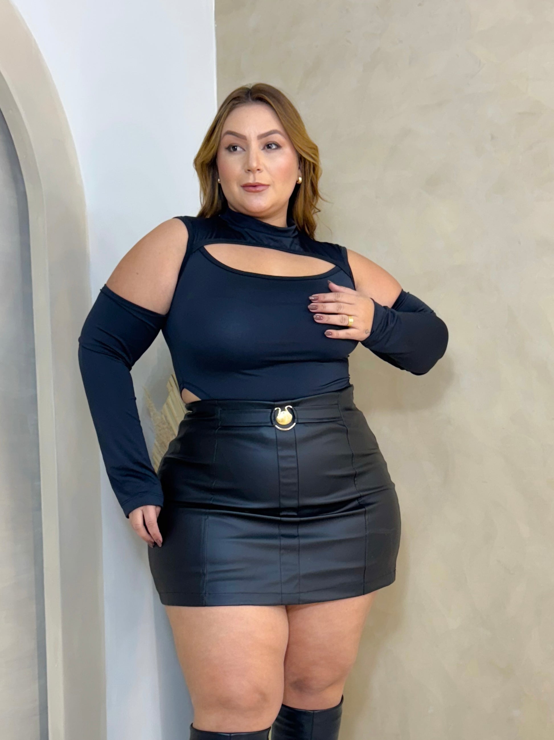 Acabamento: Recorte estratégico no busto que valoriza o colo, com detalhe de gola alta e mangas removíveis que proporcionam versatilidade ao visual. O design moderno une sensualidade e elegância em uma peça única. Pode ser usado com ou sem as mangas, adaptando-se a diferentes estilos e ocasiões. Perfeito para combinar com saias de cintura alta, shorts ou calças mais ajustadas.