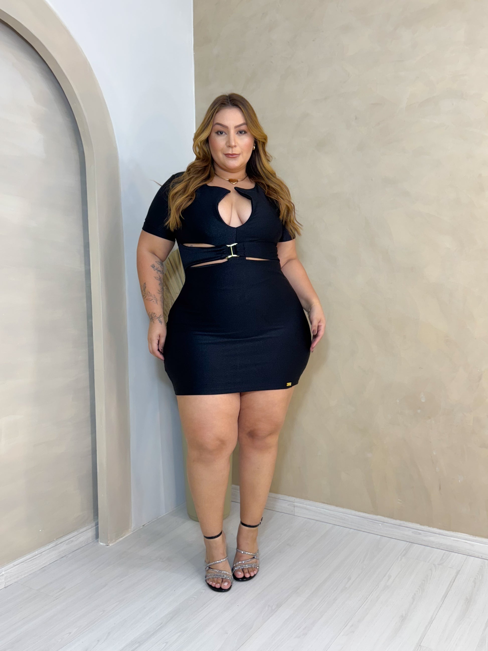 •Acabamento: Recortes estratégicos na cintura e no busto com detalhe de fivela metálica central, que trazem sensualidade e ousadia à peça sem perder a sofisticação.