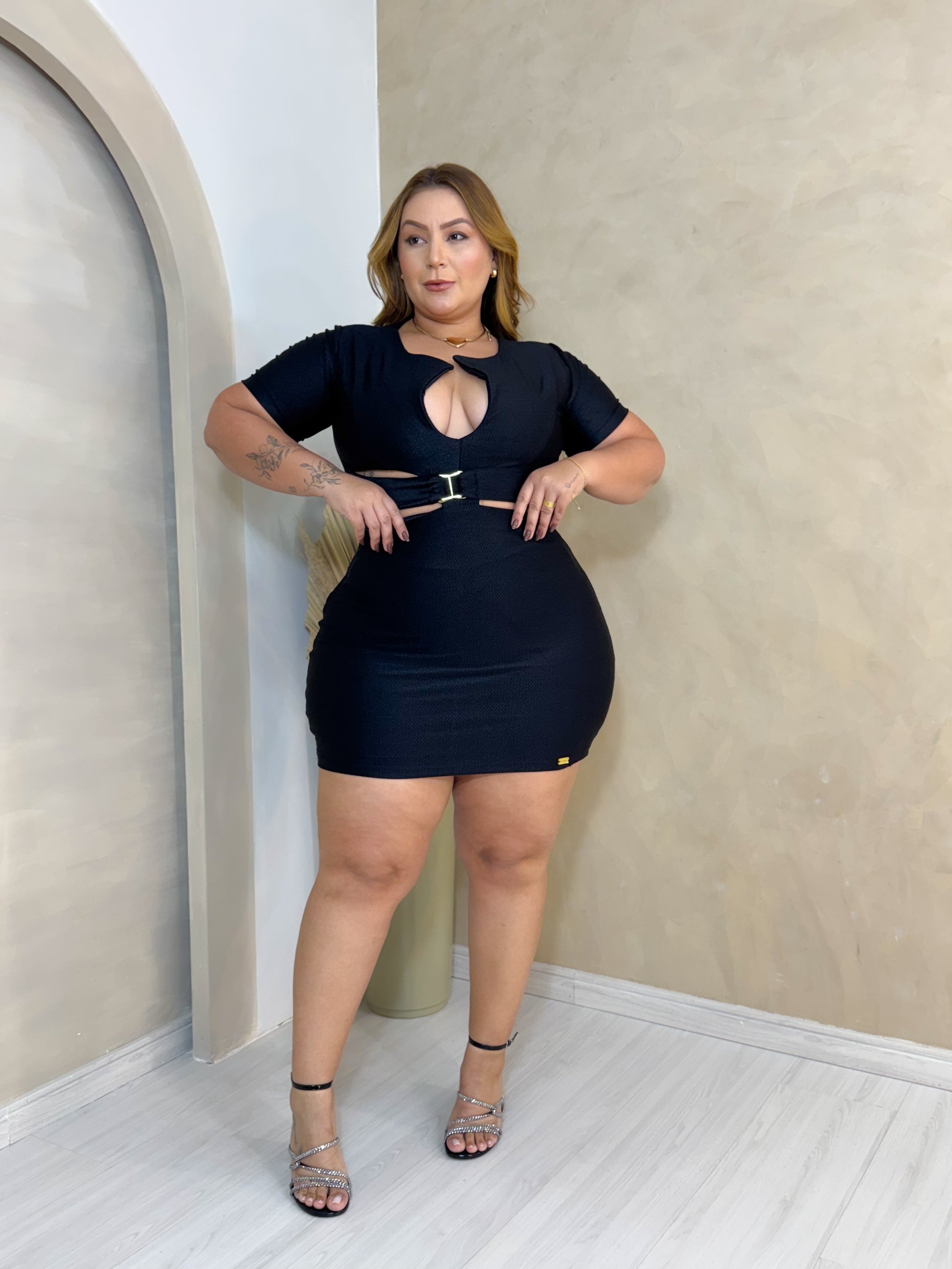 Vestido Plus Size Curto em Textura Preta com Recortes e Fivela Frontal